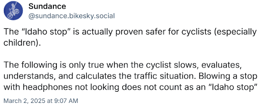 - The Idaho Stop is safe only when certain conditions are met, as this Santa Cruz advocate says well: