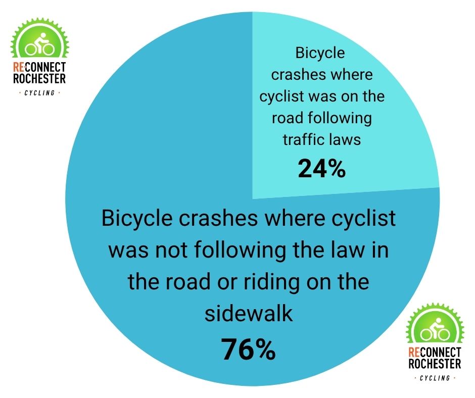 As promised, we wanted to follow up our March blog examining the most common cyclist crash in Monroe County with further analysis. A huge component of safety is knowing what those common crash scenarios are and what we can do to significantly diminish the likelihood of our involvement in them. Though this article focuses more on road user behavior and errors, know up front that Reconnect Rochester spends most of our time focusing on better street design (engineering!) as the best solution.