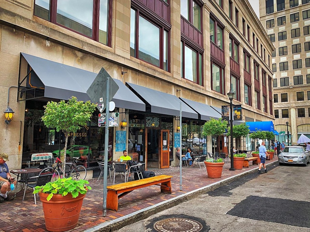 As winter loosens its grip on Rochester, I’m eager to get outside and enjoy the sunlight of longer days. Many of my cherished fair-weather memories share a common thread: the terrace and the plaza. Internationally, outdoor drinking and dining are cultural institutions. Town squares and city streets around the world are packed with tables. The air is filled with the sounds of conversation and the smell of fresh food. City planners and community members are intentional about creating safe, calm oases within the urban context to eat, drink, walk, and socialize.