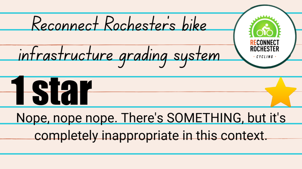 Everyone’s experience and degree of comfort along various bike facilities is different. And that’s okay. We’re proud to present Reconnect Rochester’s custom grading system below, along with penultimate examples for each tier in my opinion. If you’d grade these examples differently, that’s fine, indeed expected. That’s why we’re grading each project collectively and taking the average.